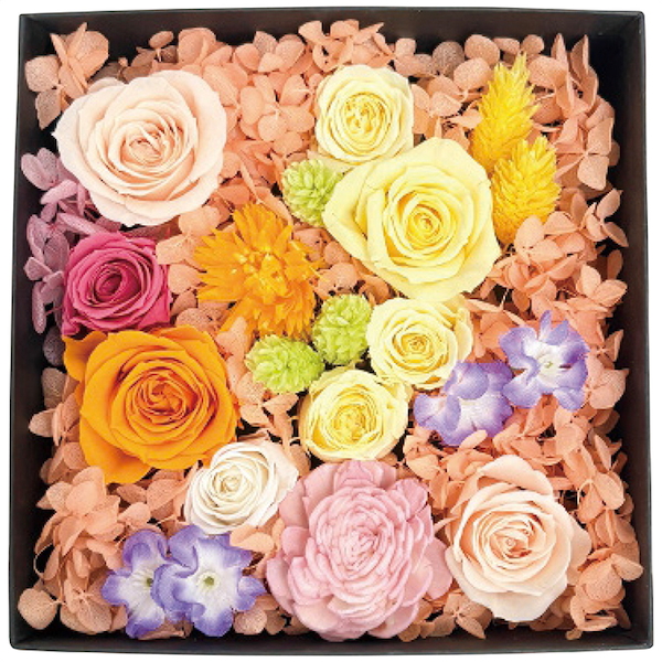 高級感のある紙製ボックスの中は枯れないお花の庭園。生花を特殊な溶液につけ保存加工したプリザーブドフラワーは洗練された繊細さと美しさを表現してくれます。