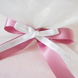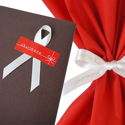 それぞれのラッピングカラーに合った幅広の大きなリボンの上に、okurimonoのロゴの入ったリボンを重ね、上品で華やかなラッピングに仕上げます。