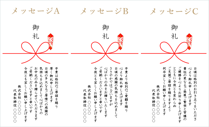 メッセージの種類はご用途別に定型文をご用意しております。お中元やお歳暮の場合はご購入時に定型文A・B・Cよりお選びください。また、設立記念祝や特別な贈りものなど、お客様ごとに特別なメッセージを作成し記載することも可能です。